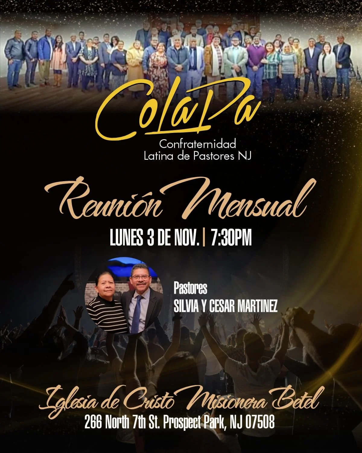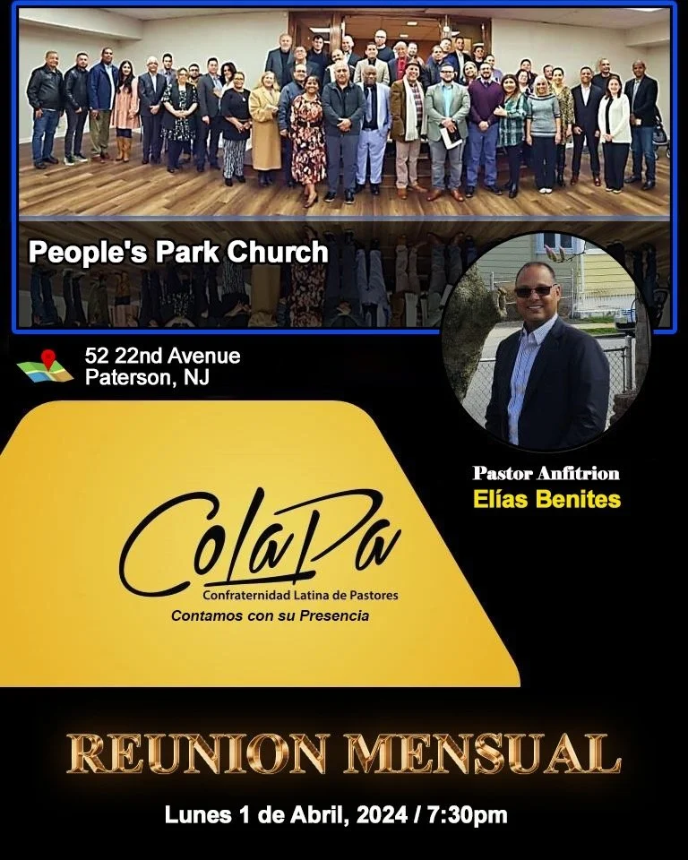 Colapa - Confraternidad Latina de Pastores es la organización oficial de Pastores Latinos en nuestro estado. Fundada en el 2013 como Latino Pastor's Assocation of Paterson creyendo en la vision de la Unidad toma en Enero 2022 el nombre de COLAPA.